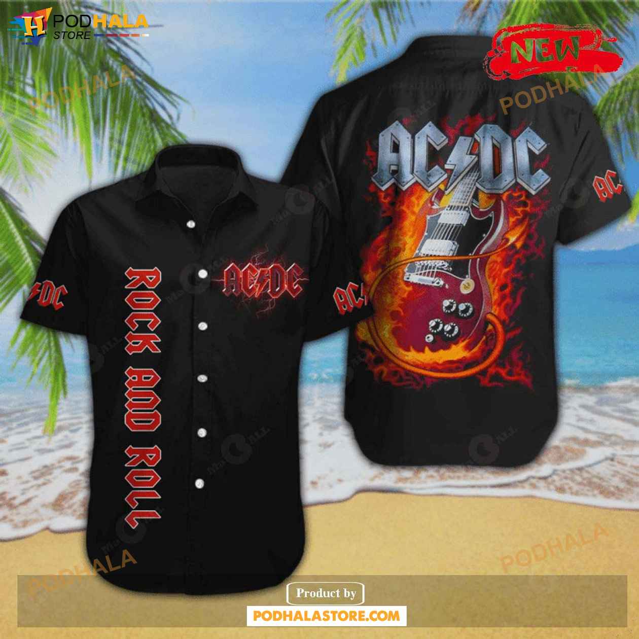 Acdc Rock And Roll Black Fire Guitar Design Hawaiian Shirt