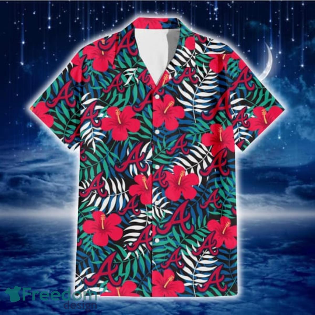Atlanta Braves Red Hibiscus Green Blue White Leaf Black Background 3D Hawaiian Shirt Gift For Fans