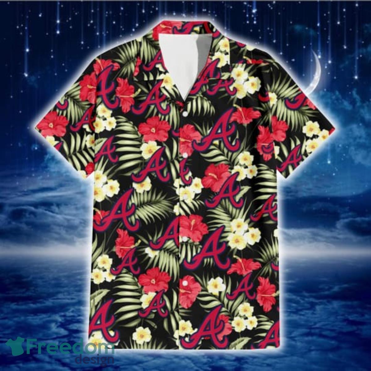Atlanta Braves Red Hibiscus Yellow Porcelain Flower Black Background 3D Hawaiian Shirt Gift For Fans
