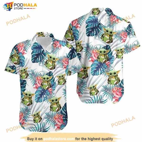 Baby Yoda Hugging Coconuts Seamless Tropical Blue Leaves Colorful Flowers On White Hawaiian Shirt