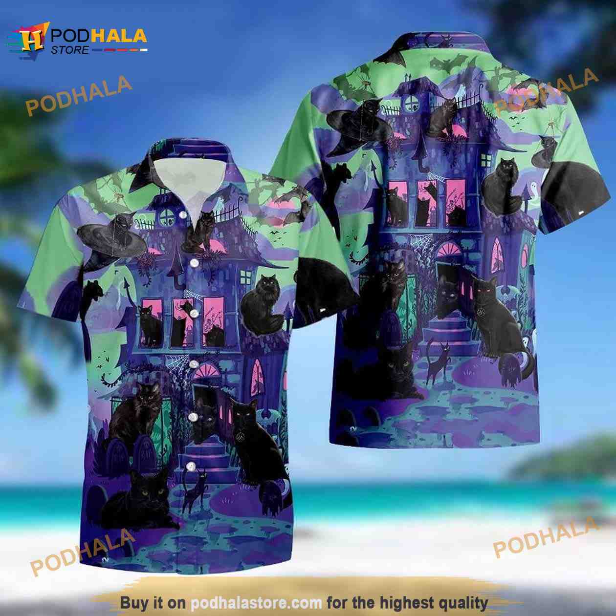 Black Cats In A Haunted House Hawaii Shirt, Black Cat Shirt, Cat Lover Hawaii Shirt