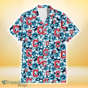 Cleveland Indians Blue Line White Hibiscus Black Background 3D Hawaiian Shirt Gift For Fans
