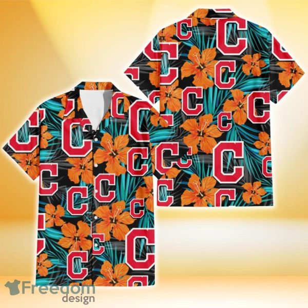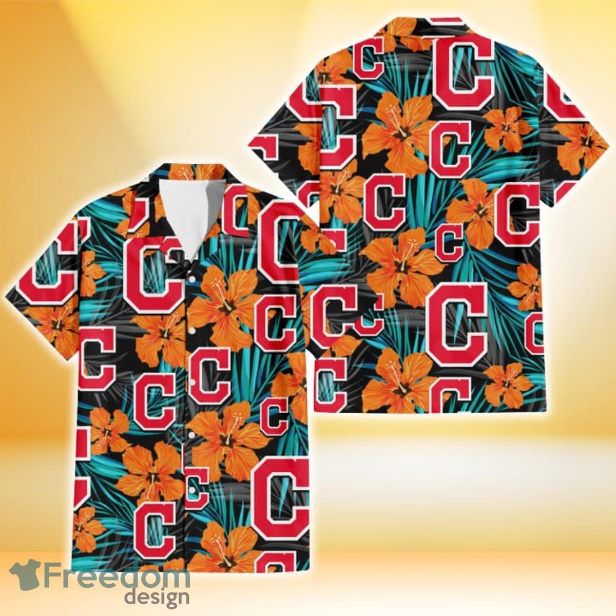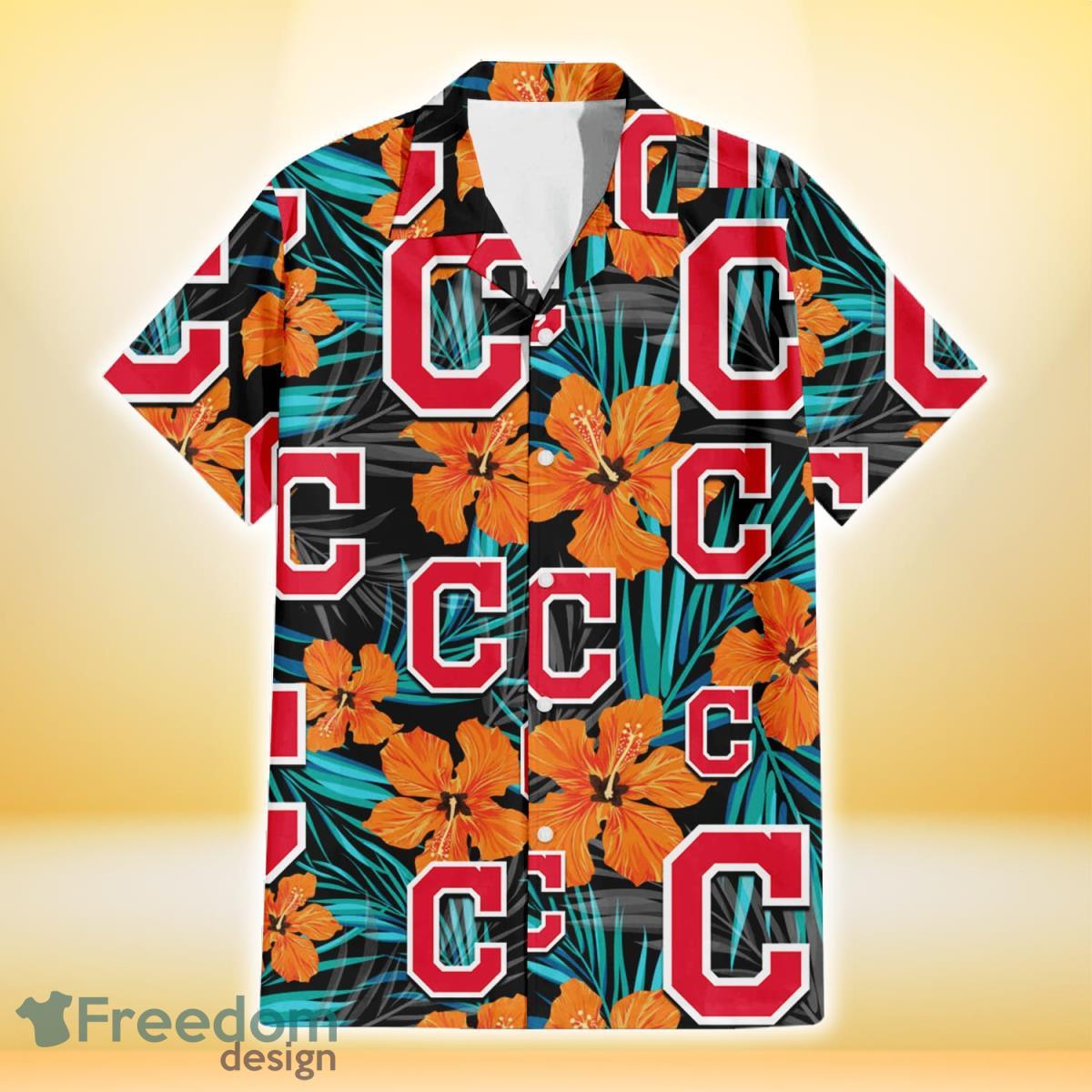 Cleveland Indians Orange Hibiscus Blue Gray Leaf Black Background 3D Hawaiian Shirt Gift For Fans