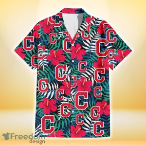 Cleveland Indians Red Hibiscus Green Blue White Leaf Black Background 3D Hawaiian Shirt Gift For Fans