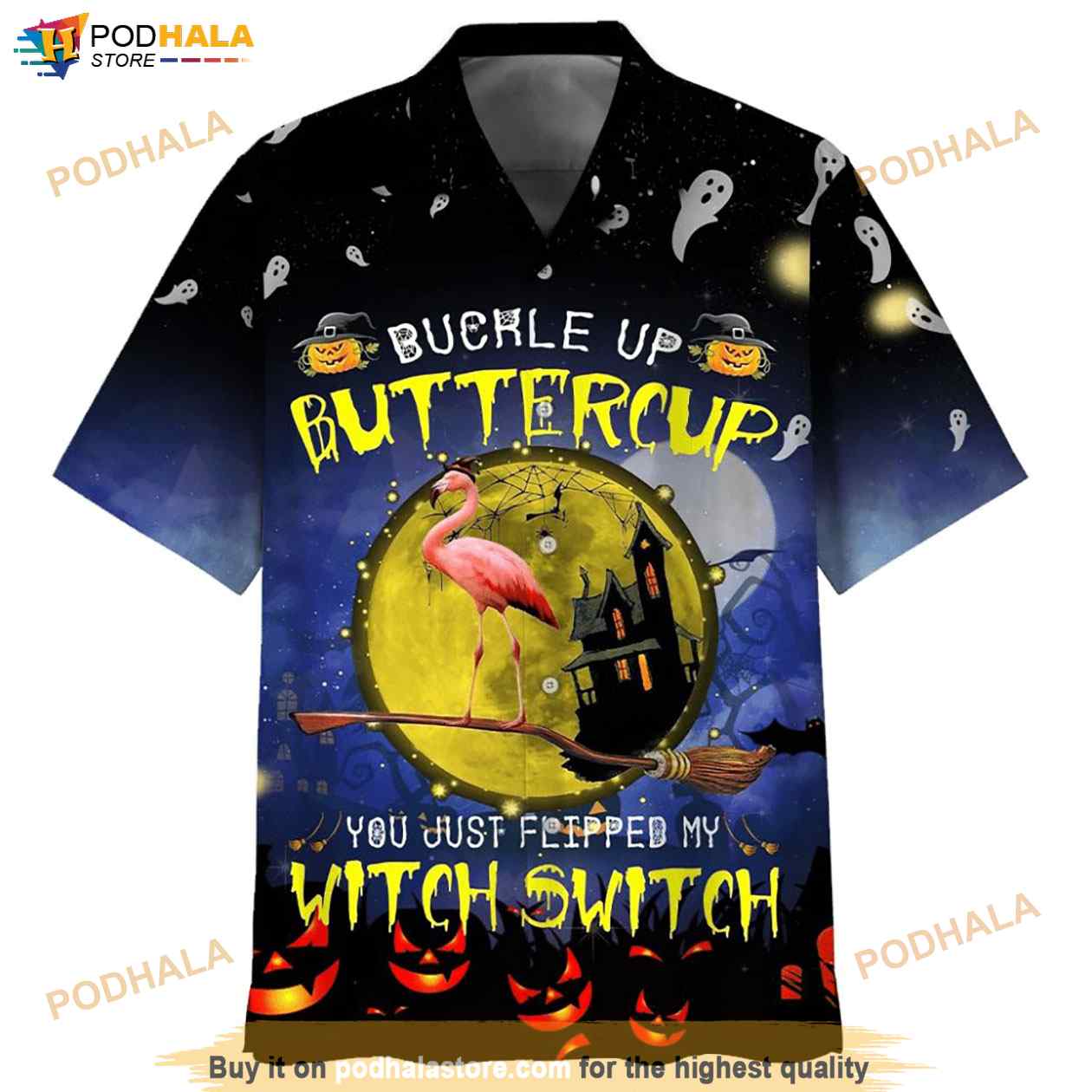 Flamingo Witch Halloween Buckle Up Buttercup You Just Flipped My Witch Switch Print Funny Hawaiian Shirt