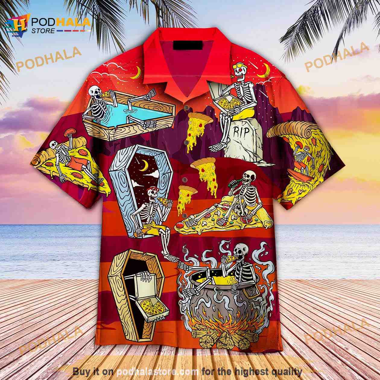 Get the look you need for any occasion with Honor Skull Eating Pizza Hawaiian Shirt For Men and Women. These customizable hawaiian shirts are perfect for any festival, party, vacation, or time at the beach. With multiple color options available these shirts will make you the real eye-catcher at any event!