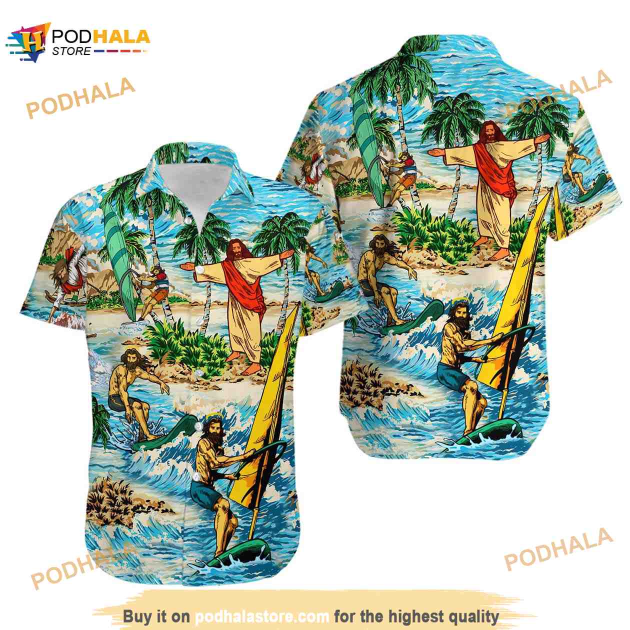 Jesus Surfing Summer Tropical Aloha Funny Hawaiian Shirt