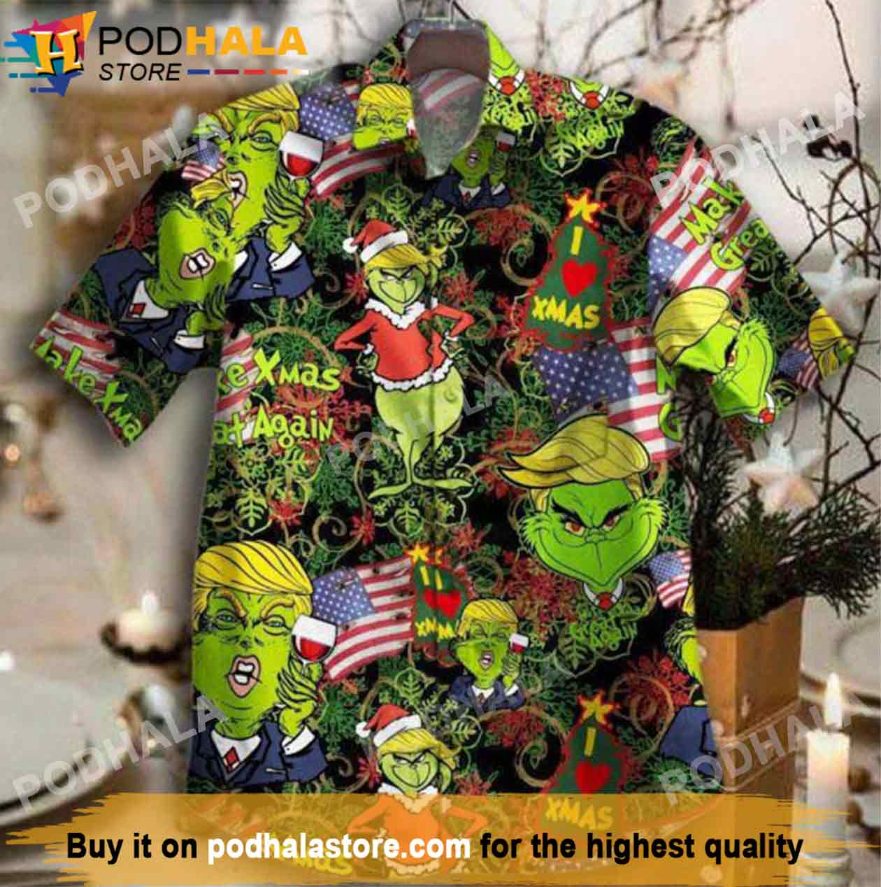 Get the look you need for any occasion with Merry Christmas Donald Trump Grinch Hawaiian Shirt, Grinch Christmas Gifts. These customizable hawaiian shirts are perfect for any festival, party, vacation, or time at the beach. With multiple color options available these shirts will make you the real eye-catcher at any event!