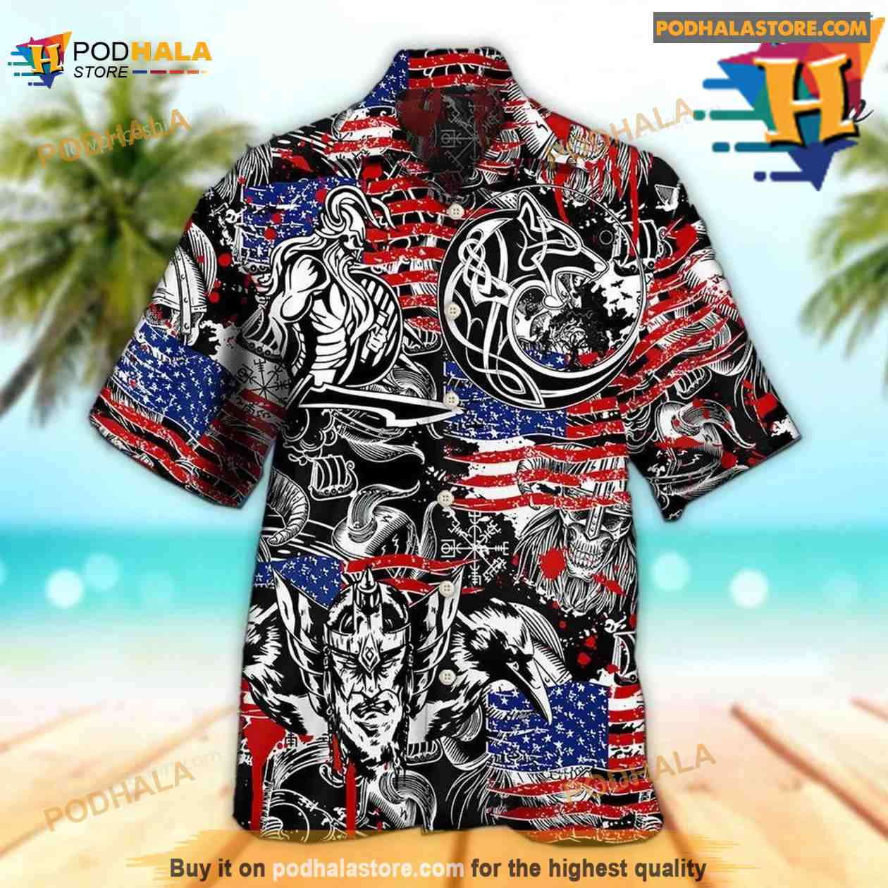 Get the look you need for any occasion with Viking Independence Day Odin Warrior And Wolf Hawaiian Shirt. These customizable hawaiian shirts are perfect for any festival, party, vacation, or time at the beach. With multiple color options available these shirts will make you the real eye-catcher at any event!